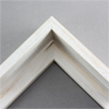 This stair step wood floater frame has a matte white finish with a steep upper and small lower step. The canvas will hover neatly within the simple, modern border.