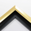 This stair step wood floater frame has a high shine, brushed gold finish with a steep upper and small lower step. The canvas will hover neatly within the simple, modern border.