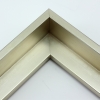 This stair step wood floater frame with a high shine lets your canvas hover neatly within the simple, modern border. The frame features a brushed silver finish with a steep upper and small lower step. The iridescent color varies slightly in different light, running from warm, muted gold to cool, opaque silver.