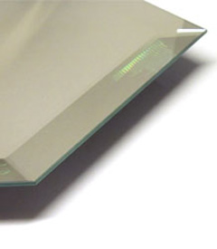 Once the mirror has been removed from the evaporator, it is ready to be packaged and shipped. Alternately, the edges may be bevelled at this time. This is done by grinding down the glass at the edges of the mirror, and results in a slope that adds dimension to the flat surface. Bevels range from 1/2" to 1-1/2" wide.